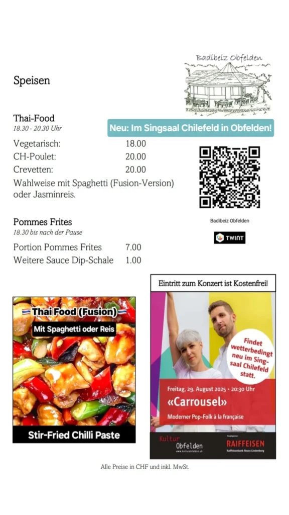 Die Badibeiz Obfelden bewirtet den Singsaal mit einem Asia-Büffet und Getränke. Nicht verpassen!