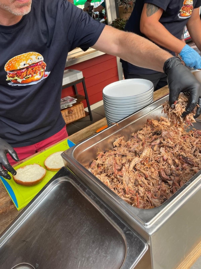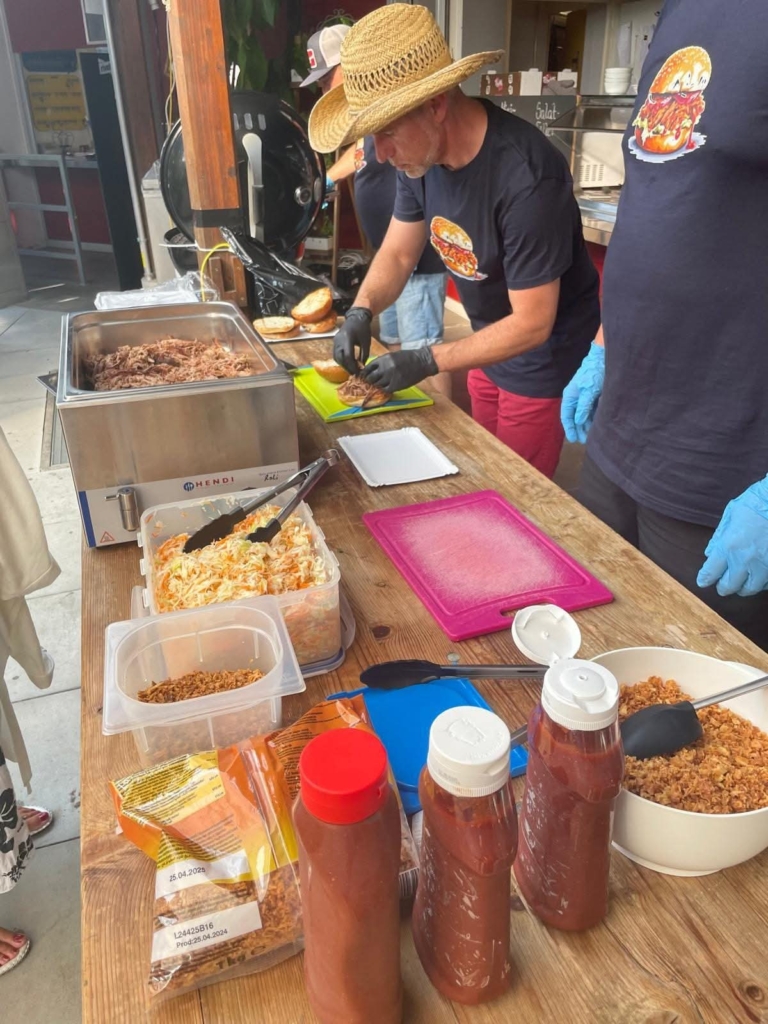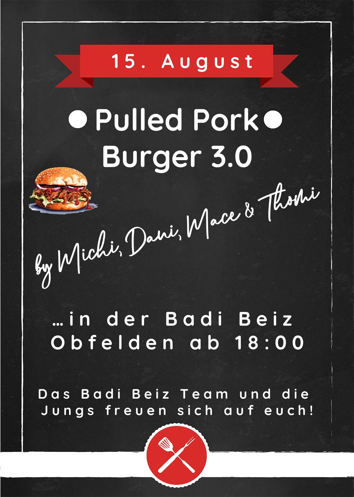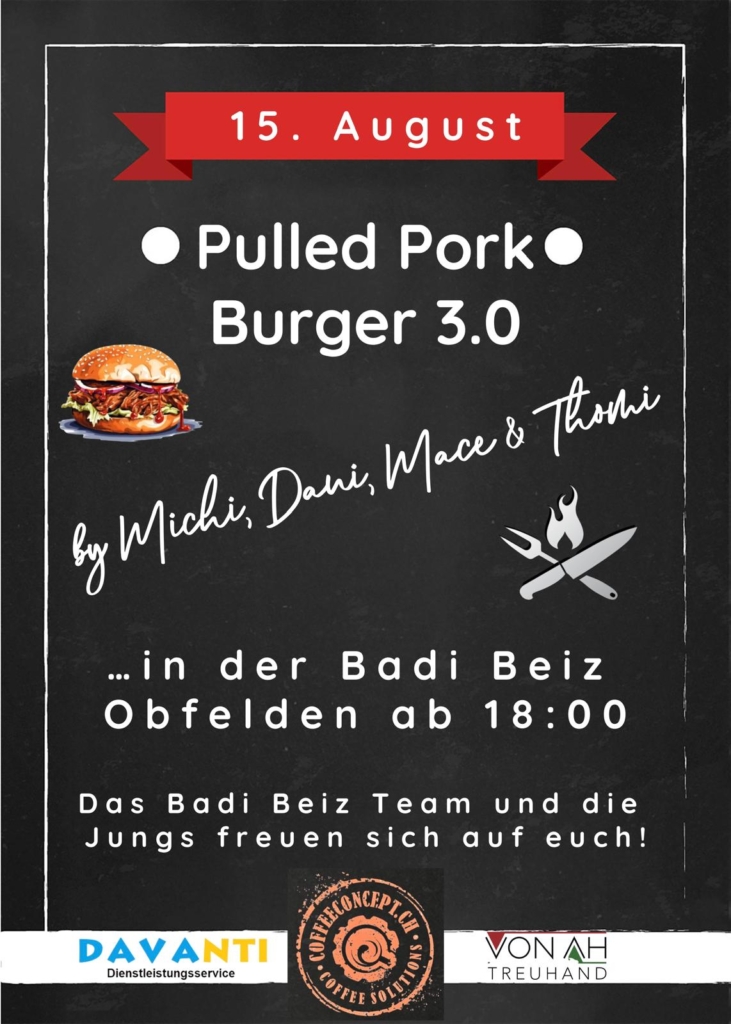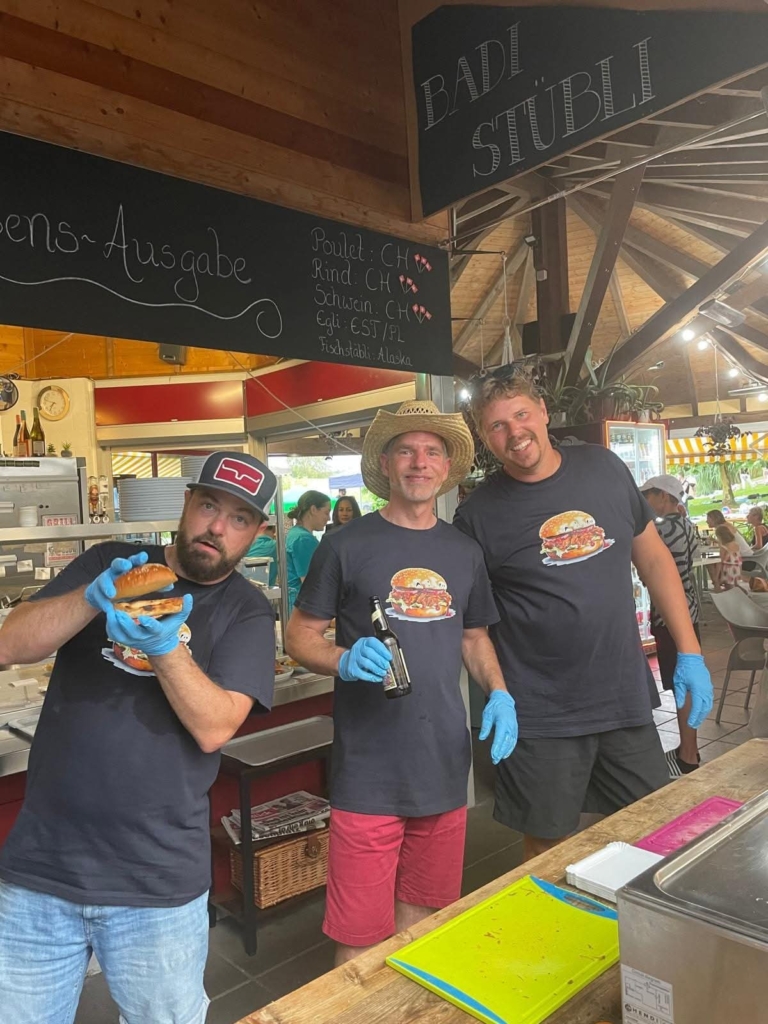 Die Jungs Michi, Mace, Thomas und Dani verwöhnen zum dritten Mal mit ihrem gesmokertem Pulled Pork und hausgemachter BBQ-Sauce die Gäste beim Nacht-Schwimmen.